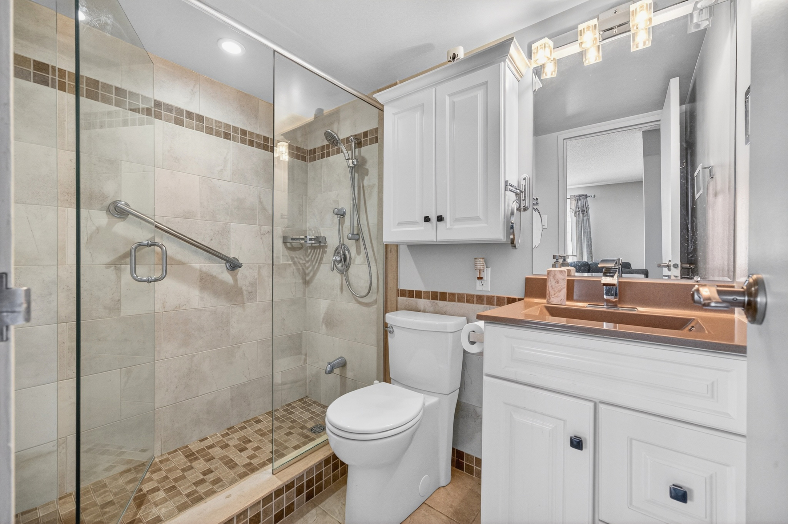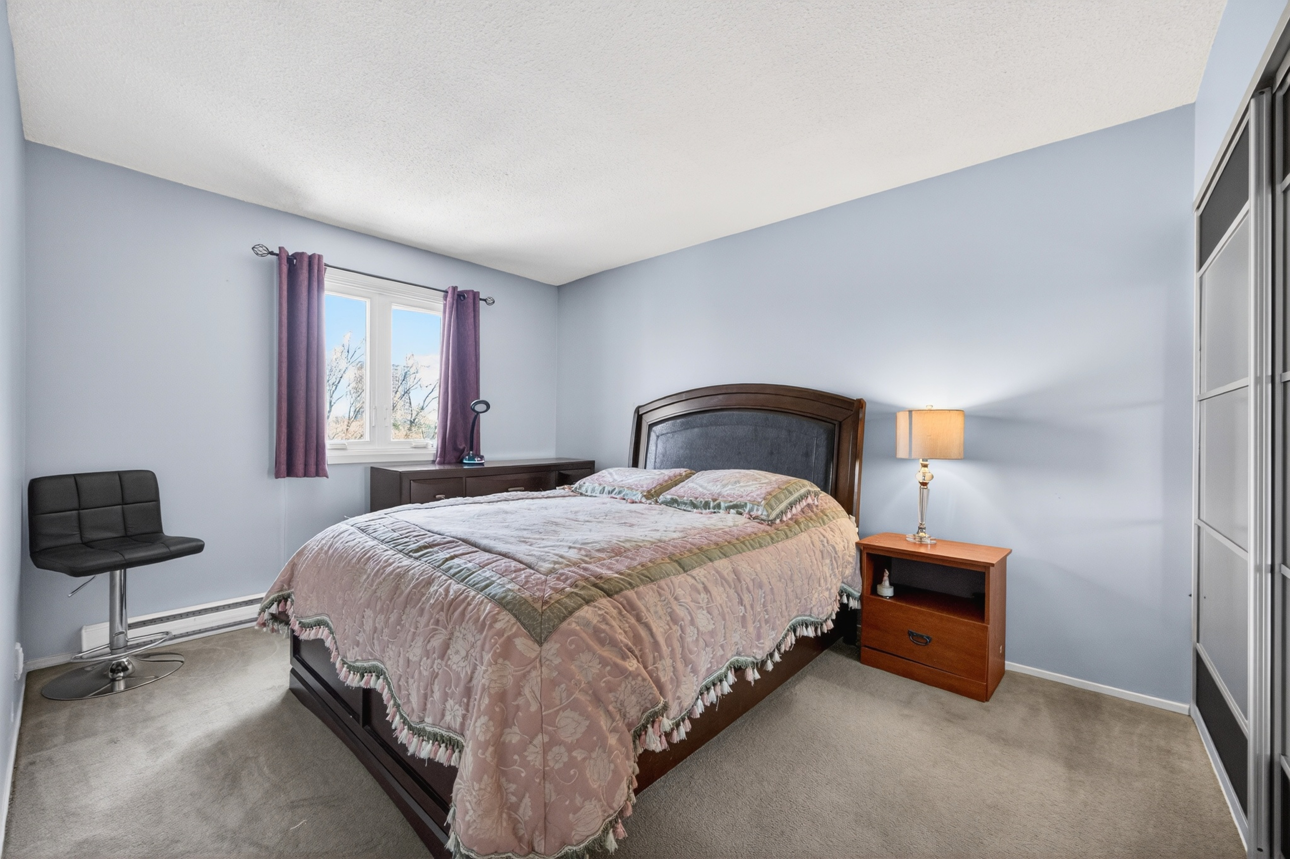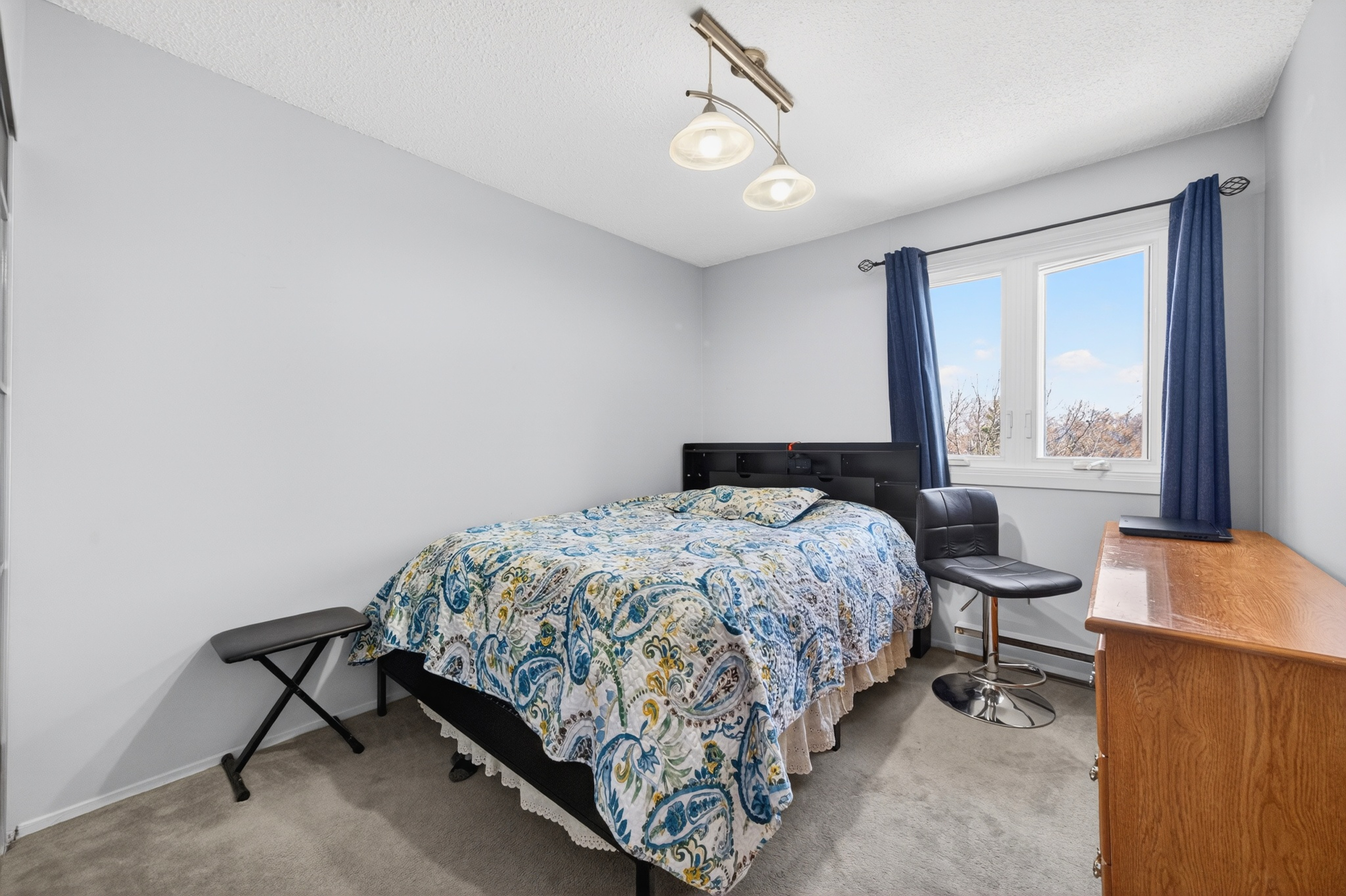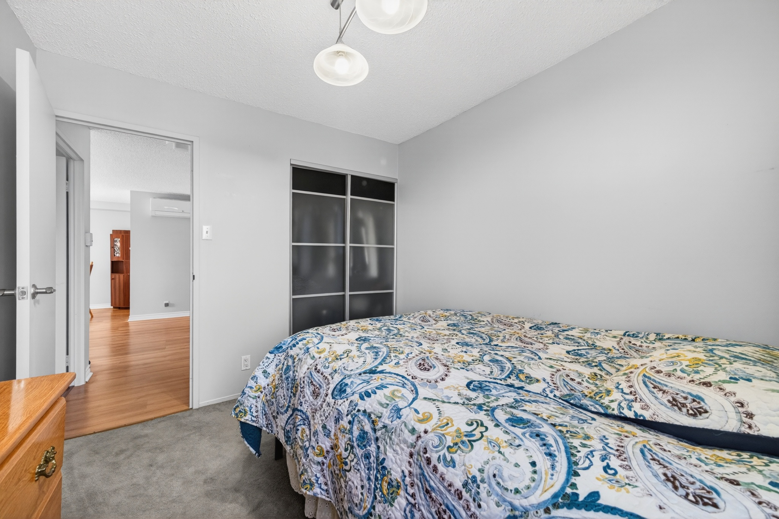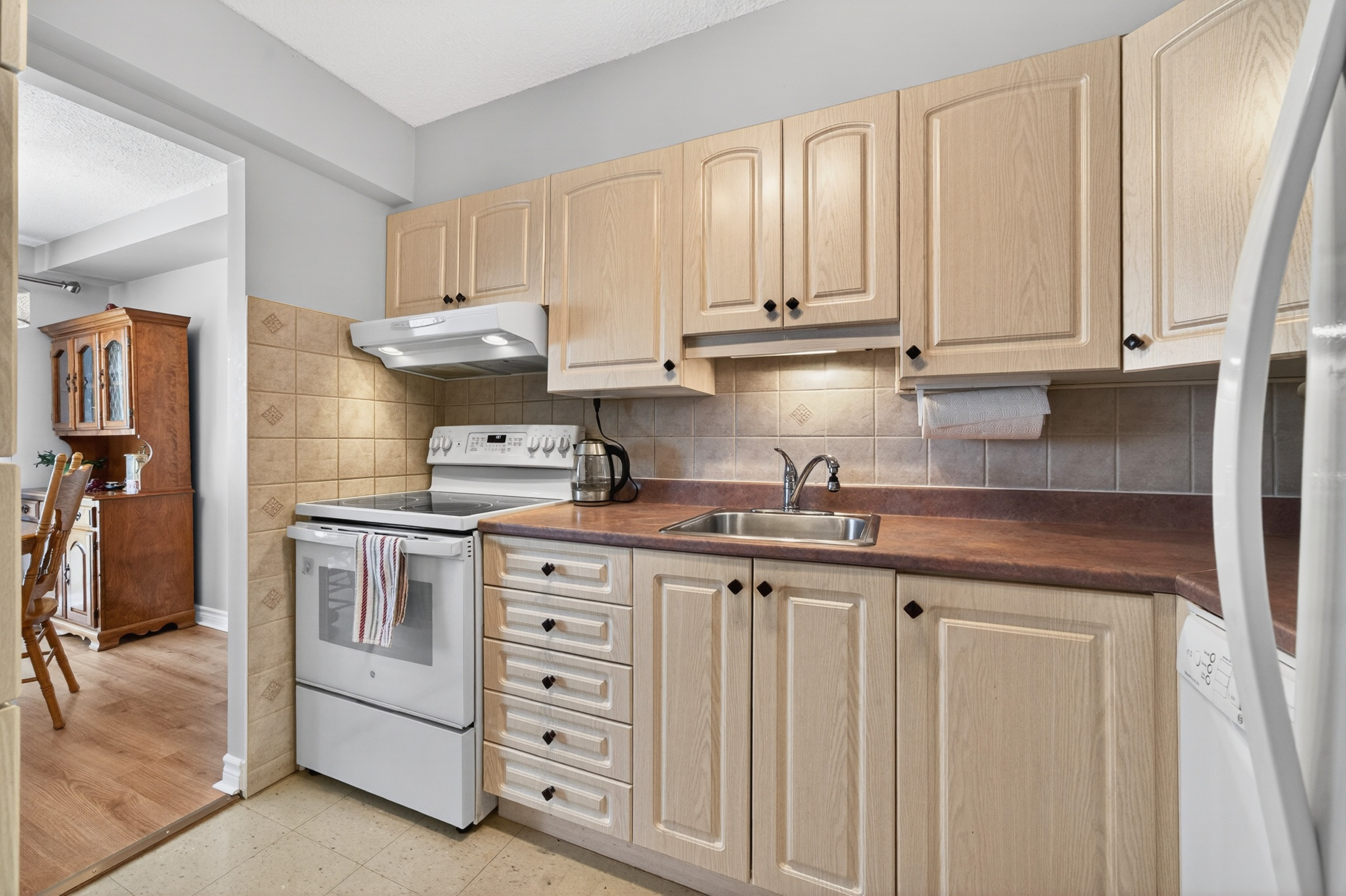 Inside, the updated kitchen features ample cabinetry, and a layout that flows naturally into the dining and living areas. Soft wall-to-wall carpeting adds warmth throughout the main spaces and has just been professionally cleaned, giving the home a fresh start. Both bedrooms are spacious and filled with light, with large windows and practical closets. The updated bathroom has alluring tiling and smart storage solutions that enhance both function and style.