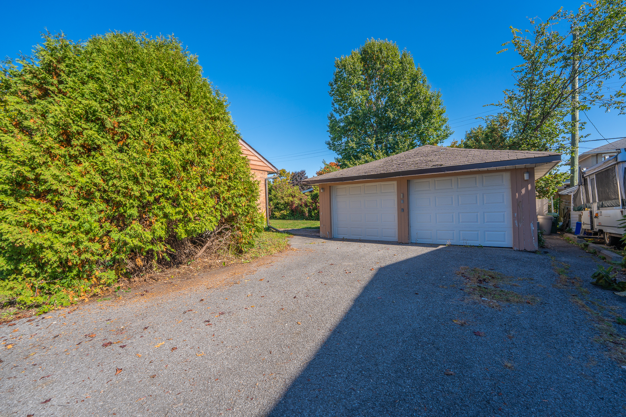 The fenced backyard features a mature cedar hedge, and two storage sheds, while parking is abundant with a detached double garage and laneway space for at least six vehicles.